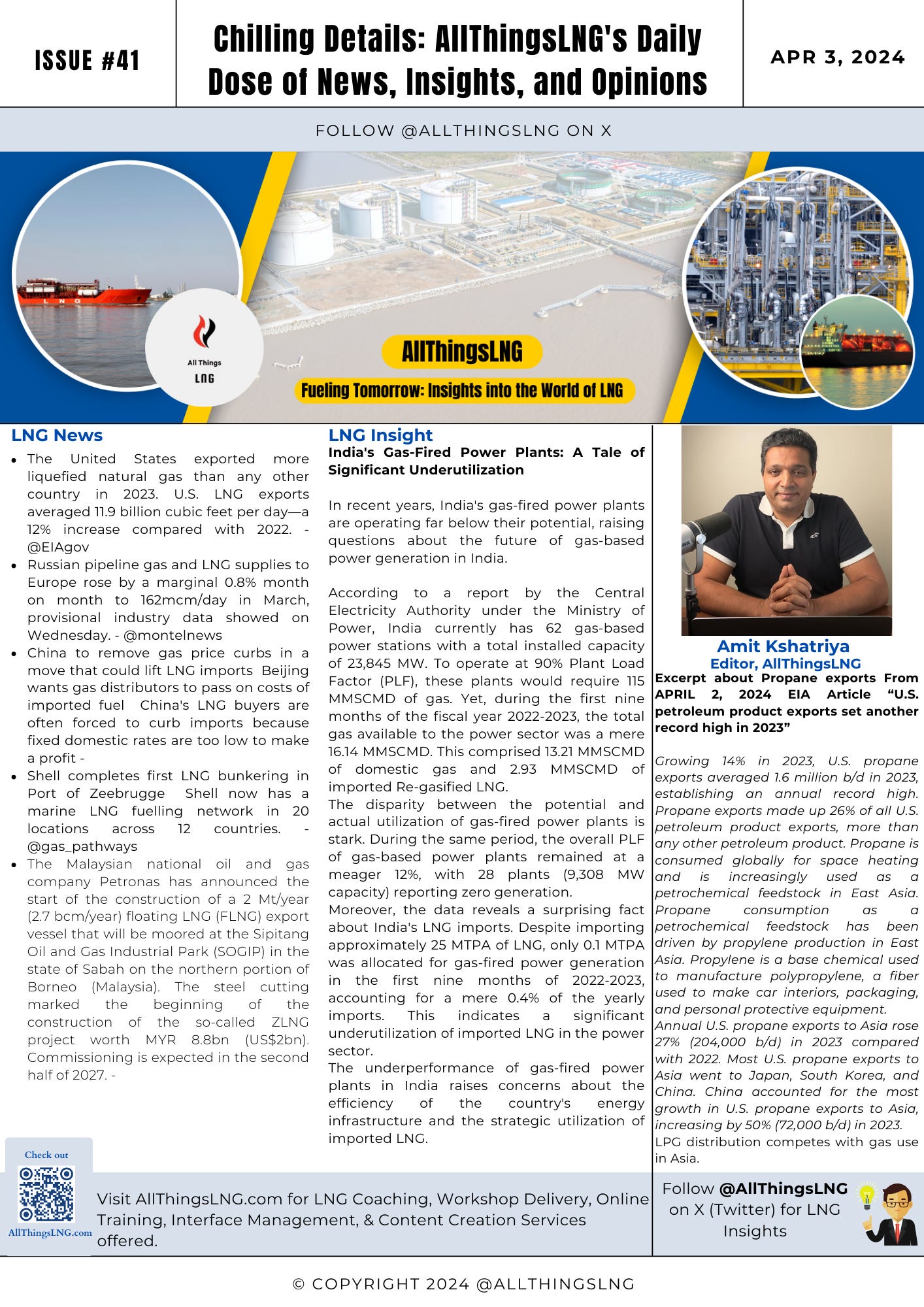 Insights: -India's Gas-Fired Power Plants: A Tale of Significant Underutilization -Excerpt about Propane exports From APRIL 2, 2024 EIA Article “U.S. petroleum product exports set another record...